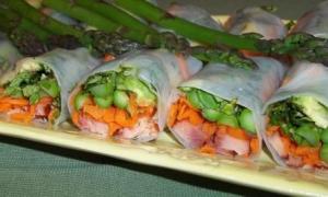 Center a strip of smoked salmon in the bottom third of the wrapper, leaving a 1-inch border on either side. Arrange 4 thick (or 6 thin) asparagus halves (overlapping as necessary) over the salmon. Top the asparagus spear halves with 2 avocado slices, 1 tablespoon carrot, and about 2 teaspoons each basil and mint. Fold the wrapper over the filling and roll into a tight cylinder, folding in the sides as you go. Repeat with the remaining wrappers and filling. Cut each finished roll in half.