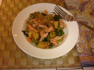 6) Divide pasta in to 4 bowls, flake salmon on top. Serve.