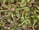 I knew there was something stranger looking than Kohlrabi–Fiddlehead Ferns! According to Wikipedia, fiddlehead ferns are the furled fronds of a young fern and are harvested for use as a vegetable. Left on the plant, each fiddlehead would unroll into a new frond (a leaf).