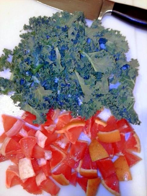 Chopped kale and grapefruit chunks. Note that the rind has been left on half of the grapefruit chunks.