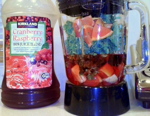 Cranberry juice, grapefruit chunks, and chopped kale ready for whirring