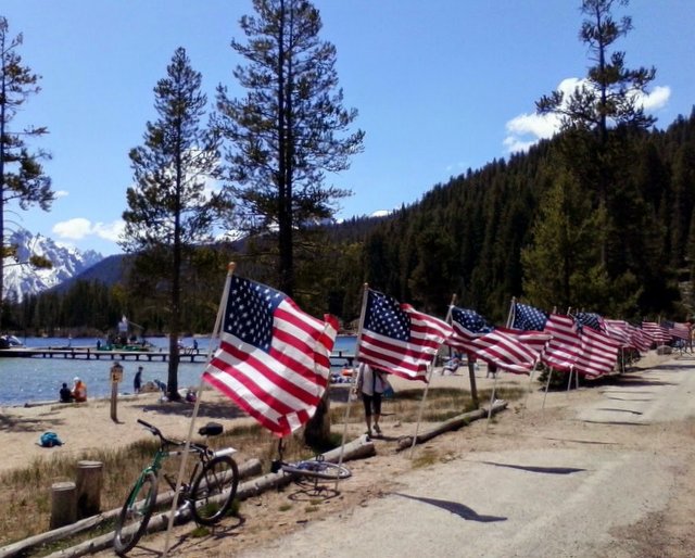 The 2014 Memorial Day run was an exceptional one for me because my 94-year old father-in-law, who was a 30-year Marine and Idaho’s oldest living survivor of three combat theaters (WWII, Korea and Vietnam), passed away a few weeks earlier. Once I was at the starting line, the singing of the national anthem before the race got my patriotic juices (and a few tears) flowing. As we stood there, we were surrounded by dozens of big American flags that were positioned along the length of the starting line/finisher’s chute near the edge of the lake. As the red, white and blue flags waved in the offshore breeze, participants and spectators were quietly reminded of the sacrifices made by our military men and women. The sight of those flags made me feel grateful for the beautiful country I live in and for the freedom to run a 10K in the mountains. This was the most touching Memorial Day weekend I’ve ever experienced.